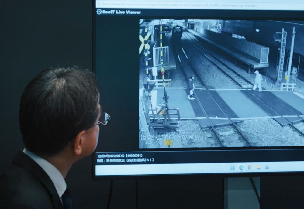 At the headquarters of Seibu Railway Co., Ltd. (Seibu Railway) in Tokorozawa City, Saitama Prefecture, Japan, computer screens display live footage from inside railroad crossings. AI cameras installed at the crossings meticulously detect the movements of pedestrians and bicycles passing through, displaying them in real time on the screens.