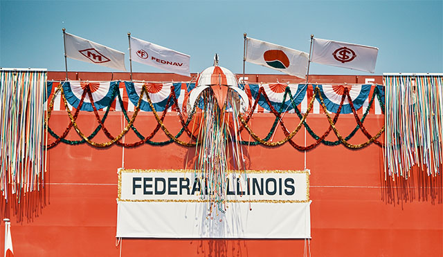 The Federal Illinois, a bulk carrier of 63,000 DWT (deadweight tonnage), was built by the Imabari Shipbuilding Co. Ltd. Its model, “NEW I-STAR,” is the company’s best-selling series, which is highly acclaimed and named “one of the best” by Mr. Nakagawa of Fednav, an expert in the maritime business who has 34 years of experience. Including the former model, “I-STAR,” more than 200 vessels of this series have been delivered to date. Compared to its predecessor, the NEW I-STAR has a larger capacity, which has been increased by more than 2,000 deadweight tons, while it consumes less fuel, cut by about 10 percent as a result of employing new energy-saving technologies.