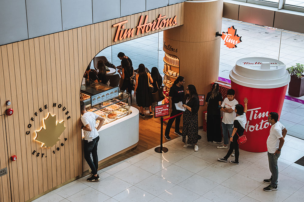 On the sixth morning after its grand opening in Singapore on November 17, 2023, Canada’s favorite coffee shop, Tim Hortons®, housed inside Vivo City Mall, the country’s largest shopping mall, was crowded with people longing for a taste of Canada. The coffee shop is furnished with wood tables and chairs, with maple-leaf motifs hanging from the ceiling. Along with a brewed coffee or latte, many customers were having a grilled sourdough sandwich; maple glazed chicken ham and cheese seems to be the top local favorite. Outside the store, there was a long line of people waiting to buy a box of donuts, another iconic item Tim Hortons has to offer.