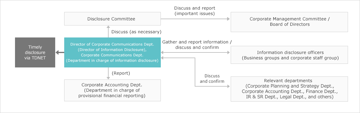 The necessity to disclose information is discussed and confirmed with the relevant divisions and departments.If necessary, the matter is brought up for discussion by the Disclosure Committee.Important matters are brought up for resolution by the Corporate Management Committee and/or Board of Directors.