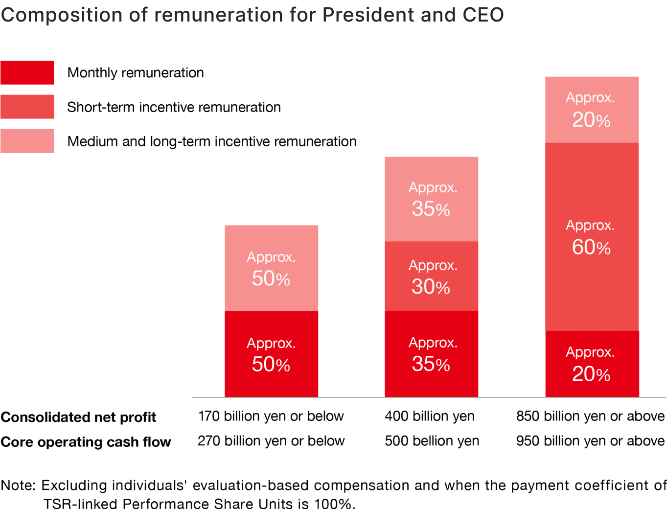 3. Remuneration levels and composition ratioTo ensure that remuneration levels of Directors are competitive so as to secure and maintain excellent human capital, the remuneration levels are examined by comparing them with objective research data on remuneration provided by outside specialized organizations and other sources to determine the appropriate remuneration levels. The composition ratio of remuneration and other payments focuses on the medium- and long-term improvement of corporate value. For the President and CEO, the composition ratio of monthly remuneration, the short-term incentive remuneration and the medium- and long-term incentive remuneration shall generally be set at 1:1:1 when consolidated net profit is 400 billion yen and core operating cash flow is 500 billion yen. For other internal Directors, the composition ratio of remuneration shall be set in accordance with the composition ratio of remuneration for the President and CEO, taking into account the role and responsibilities of each position.
