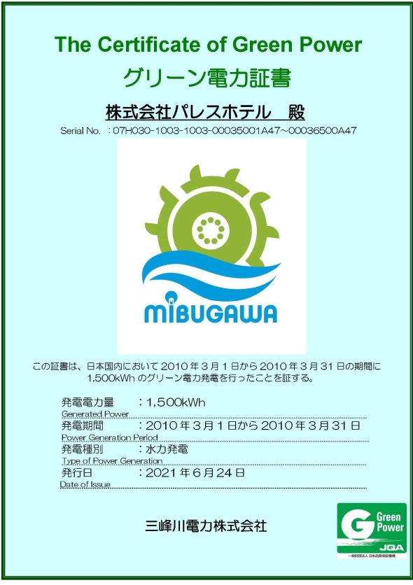 Green power refers to electricity that is generated by renewable energy such as hydropower, wind power, biomass, solar power and geothermal power. Marubeni and Palace Hotel use the "Green Power Certificate System" that trades in environmental added-value green energy. By purchasing certified green power (1,500kWh) from Mibugawa Power Company, a renewable energy operator and 100% Marubeni owned subsidiary, Palace Hotel used green power at the venue of the Ordinary General Meeting of Shareholders.