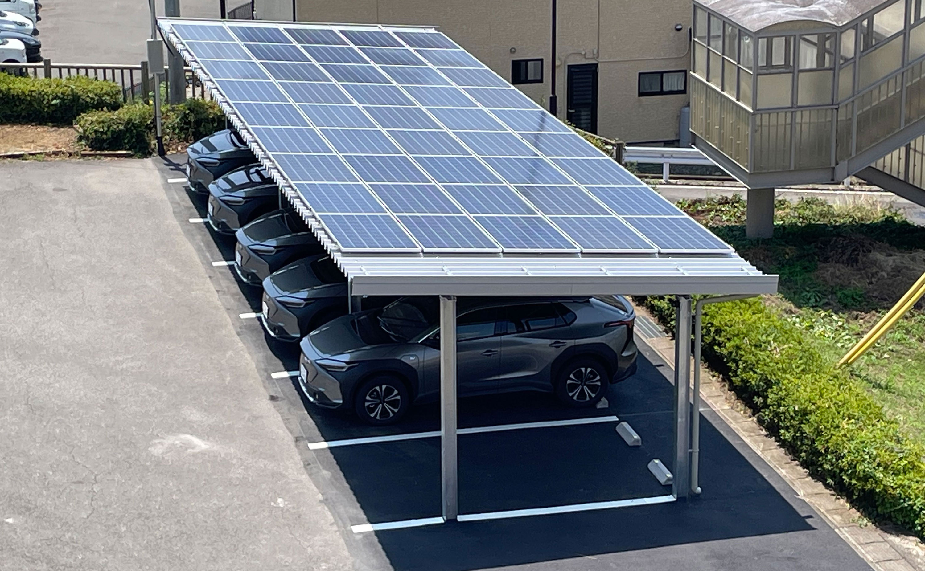 In addition, all locations will use electricity derived from renewable energy or equivalent*1 sources to charge EVs, towards realization of a Zero-Carbon campaign via zero CO2 emissions from vehicle operation. A solar carport using recycled panels*2 and stationary storage batteries will also be installed on the premises of the Tone-Numata Promotion Bureau being used as an implementation base for car sharing, to facilitate the use of solar power-generated electricity for EV recharging, as well as to enable EV recharging using stored electricity even during power outages.