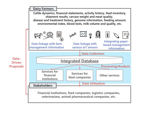 In addition to issues such as low production efficiency, farmer turnover, and lack of successors, the Japanese dairy and livestock industry faces the urgent task of increasing sustainability, such as reducing environmental impact, etc. In order to strengthen the competitiveness of Japanese livestock products in the global market, the industry must improve its productivity through the wider implementation of DX. In recent years, smart livestock production utilizing robots and IoT has become increasingly popular in Japan, but the data sets collected individually from various sensors remain unintegrated and are not efficiently utilized. In addition, timely data sharing with each stakeholder, such as feed companies and financial institutions, is necessary to improve productivity, but at present this data is not being shared sufficiently.