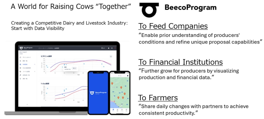 Marubeni is excited to announce the launch of a new service, Beeco Program, which utilizes a database infrastructure developed by the company that enables the efficient and real-time collection and integration of various production and financial data scattered throughout the dairy and livestock industry.