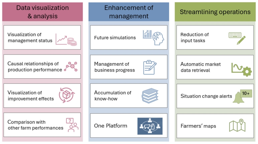 Overview of the ServiceThe service consists of three components tailored for feed companies, financial institutions, and producers. It enables the visualization and analysis of various data, enhances and streamlines farm management, and improves the efficiency of extensive operations. By sharing the collected data in a timely manner with authorized feed companies, financial institutions, and other industry stakeholders, the program aims to create new value and services within the industry.