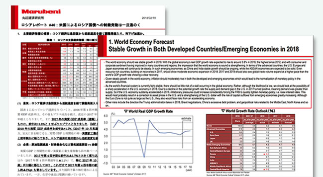 Marubeni Institute researchers, through combined experience, dispense high quality coverage of various regions and fields from concise analyses and insights into global politics, economics, industry, and other spheres to accurately pinpoint and enable rapid responses to both changes and signs of change in the business environment.