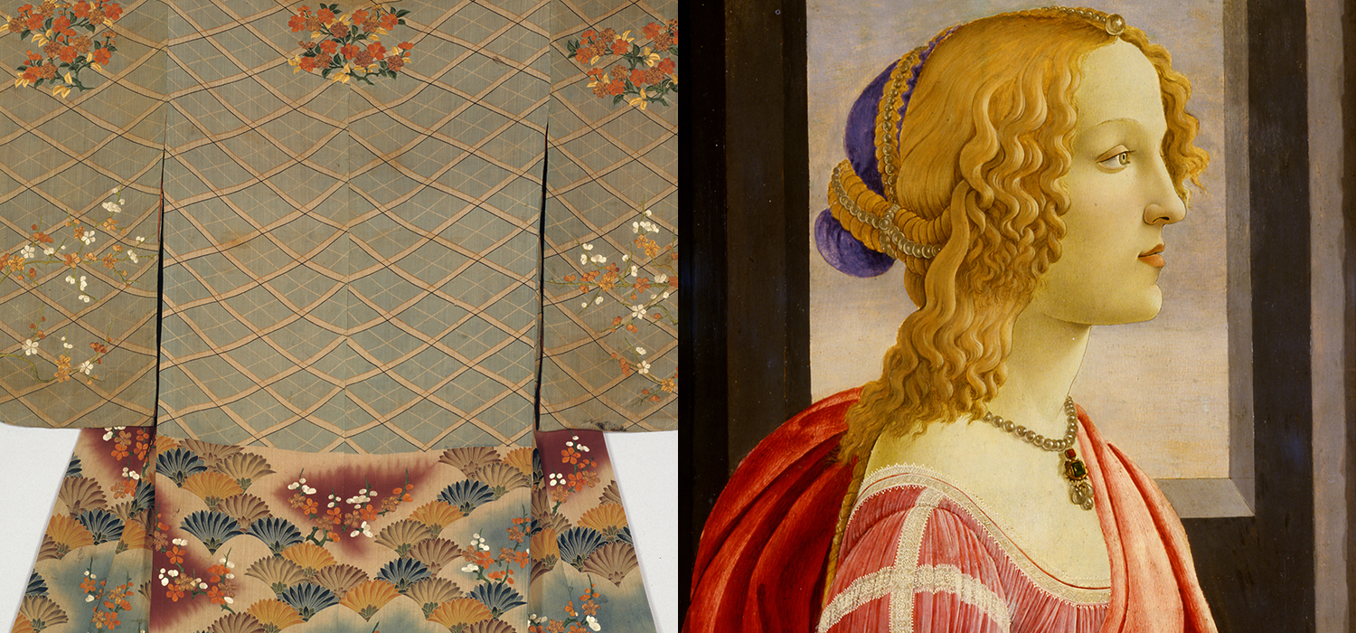 左:薄紅綸子地几帳冠檜扇模様振袖 江戸時代19世紀 丸紅株式会社蔵 右:《(着物の女性)》(部分)c.1883~1912 東京都写真美術館蔵