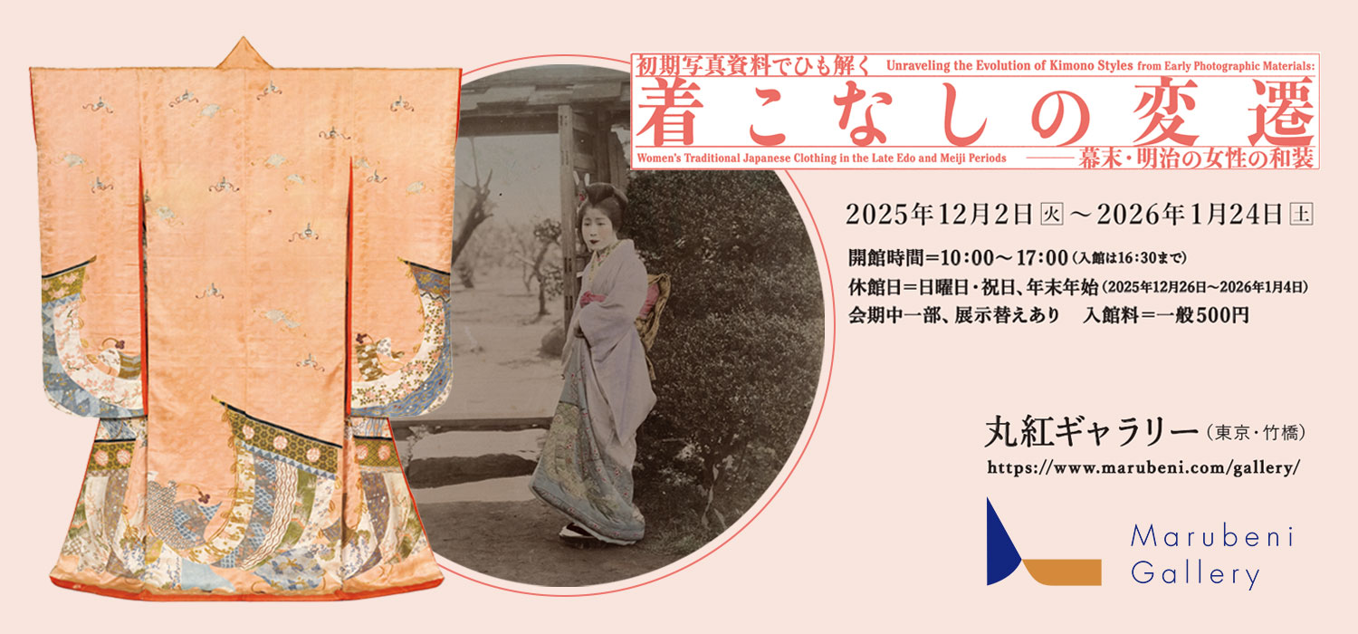 本展は、江戸時代後期から明治時代に至る和装の着こなしを、女性の服飾を例に、幕末に流入した写真や文献を参照しながら、当時の着物や帯・小物を用いて再現します。丸紅コレクションが有する豊富な着物と、丸紅が取り組む染織研究が可能にした「100年前の着こなし」を、ぜひご観覧ください。