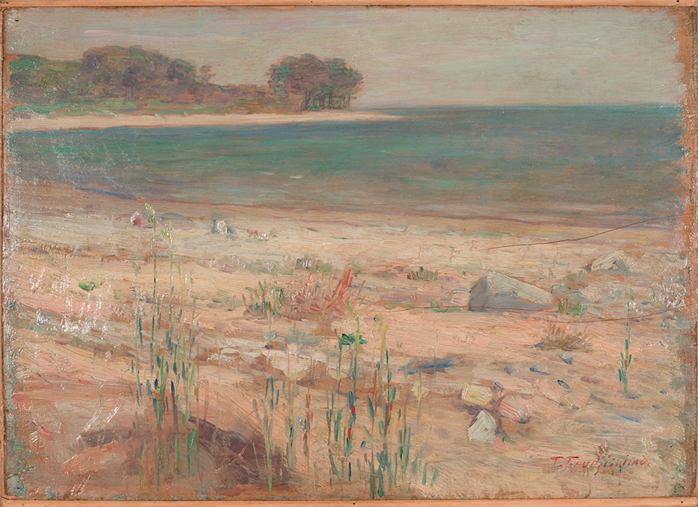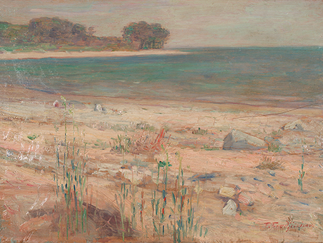 本作は初期白馬会時代の作品で、近景に雑草の生えた砂浜を、中景に穏やかな海を、そして遠景に江の島を描き、色づかいも外光派の手法を顕著に示している。
