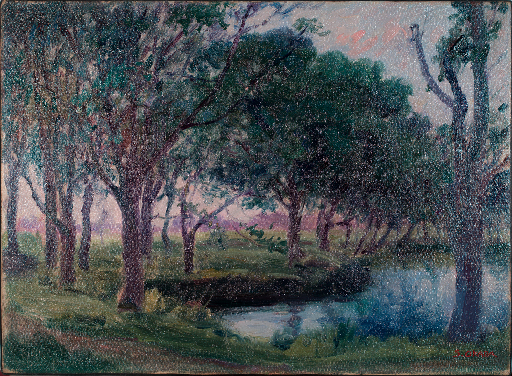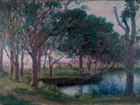 沼のあるこの風景画は、朝の清涼な光を受けた色調と、木の幹や遠景に使われている紫の高雅な情緒性に、外光派の師ラファエル・コランの影響がみられる。
