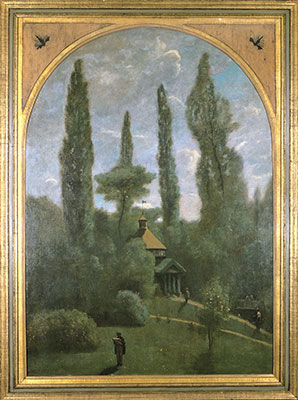 1847年の夏、体調のすぐれない父親に付き添うため、コローはヴィル=ダヴレーの実家に長く滞在した。その間、彼は庭の小さなあずまやの壁を飾る6点からなる一連の風景画を制作した。これはそのシリーズの1点で、母親の誕生日の贈り物として描かれた。絵にはコローの家族が描かれている。前景の帽子をかぶり、陽光を背にして新聞を読んでいるのは彼の父、右手奥の橋の手すりにもたれている2人の女性は母と姉と思われる。コロー自身も画帳をかかえて写生から戻ってきた姿として描かれている。また、画面中央、あずまやの前の小径には姉婿のセヌゴン氏がいて、コローを出迎えようとしている。