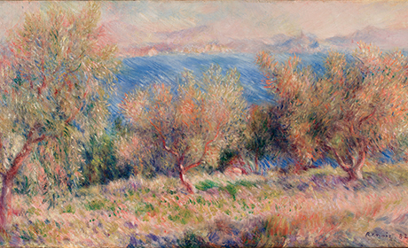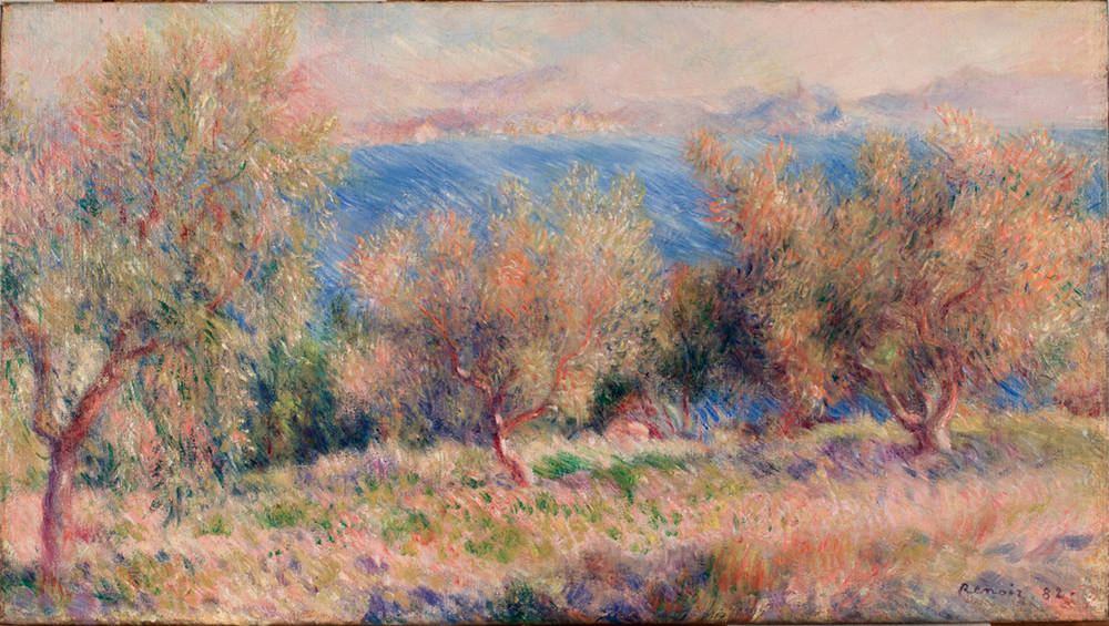本作に見られる海原や草むらの平行な斜めの筆づかいはセザンヌの描法を反映したものと思われる。オリーブ畑に降り注ぐ陽光は、木の葉や草むらに心地よく吸い込まれ、あふれた光が大気中に飛び交っている。季節は冬であるが、春のような気配がある。ルノワール自身、画商デュラン=リュエルに「風のない穏やかな日差しの春。こういうことはマルセイユではめったにないことです」と感動を書き送っている。1937年ニューヨーク・メトロポリタン美術館で開催された展覧会出品作。