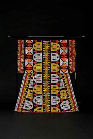 2008年から意識的に創造しはじめた「第三の美意識」を追求した結果、セルジュがたどり着いた最初の作品のひとつだ。アフリカ生地と現代的な和のスタイルの結合から誕生した『着物』は、実用的でありながら自然な美しさを醸し出す。