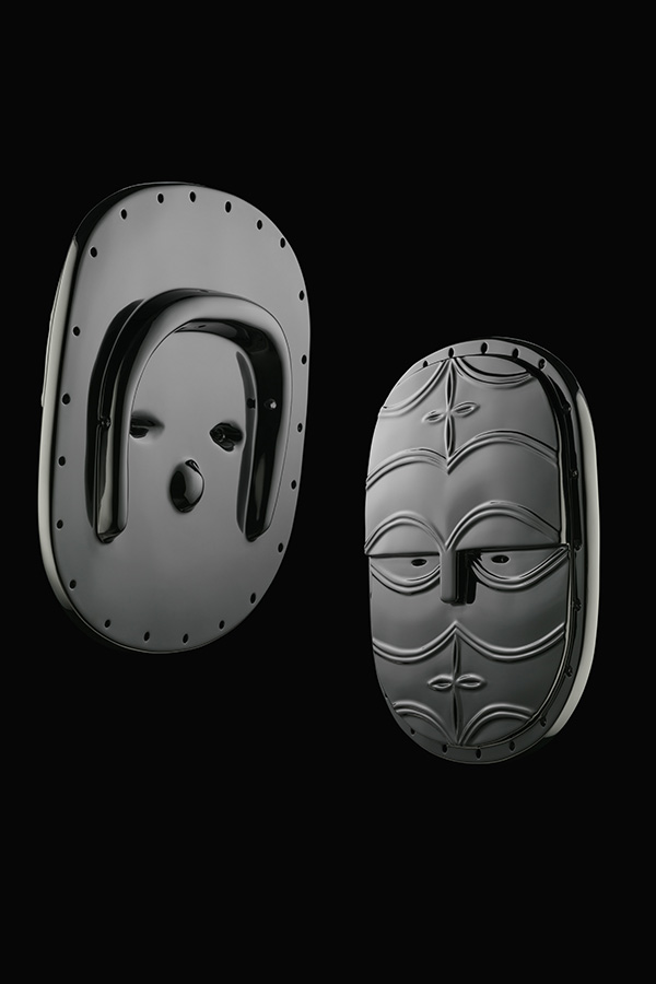 日本の漆芸とアフリカのマスクとの出会い。アフリカの木彫りマスクは、漆芸職人の大河原勝氏、大西長利氏、松島桜子氏らの協力のもと、漆を塗り重ねて平滑なフォルムへと変容する。