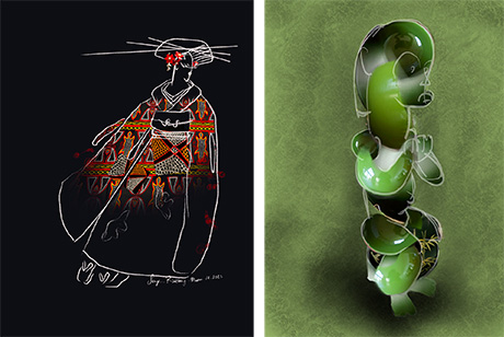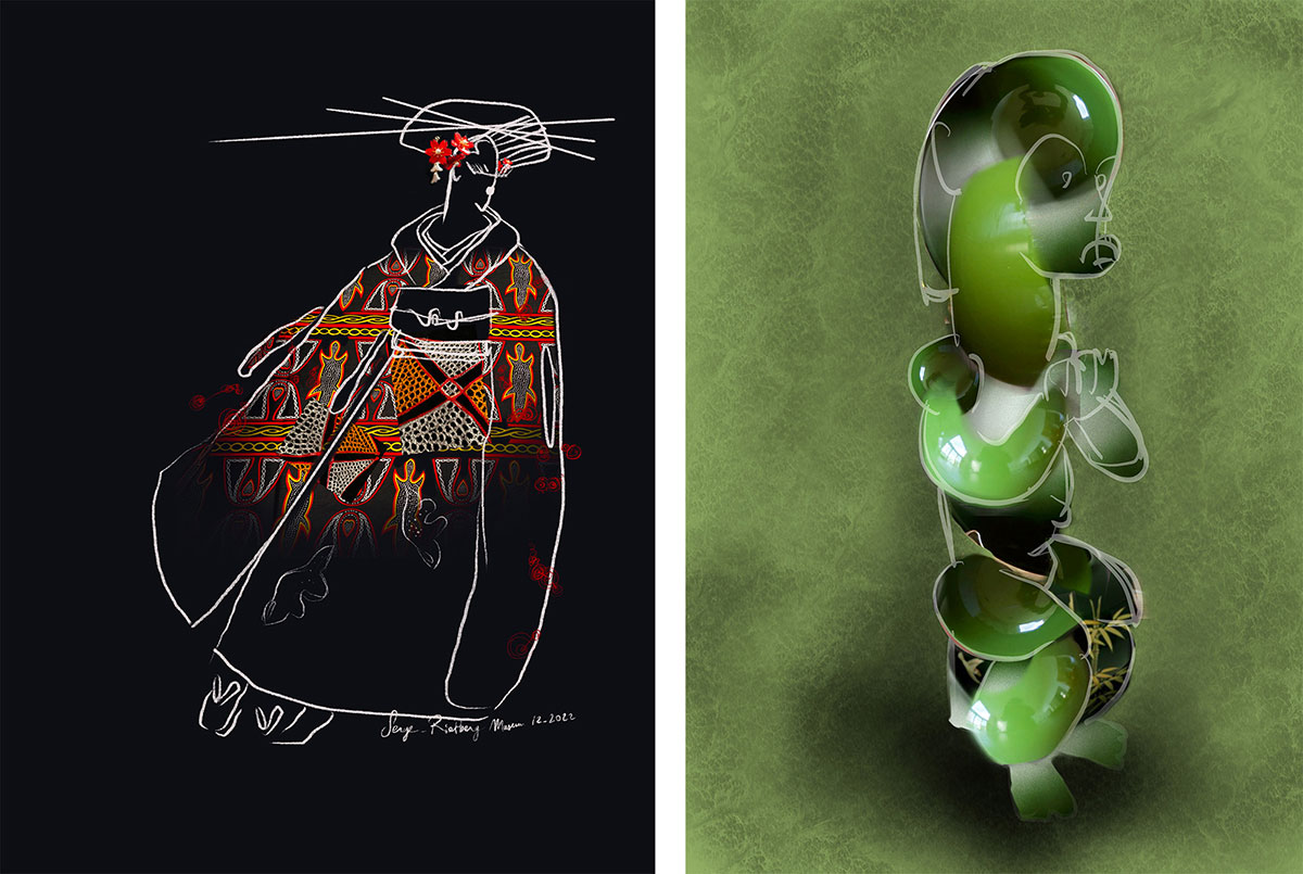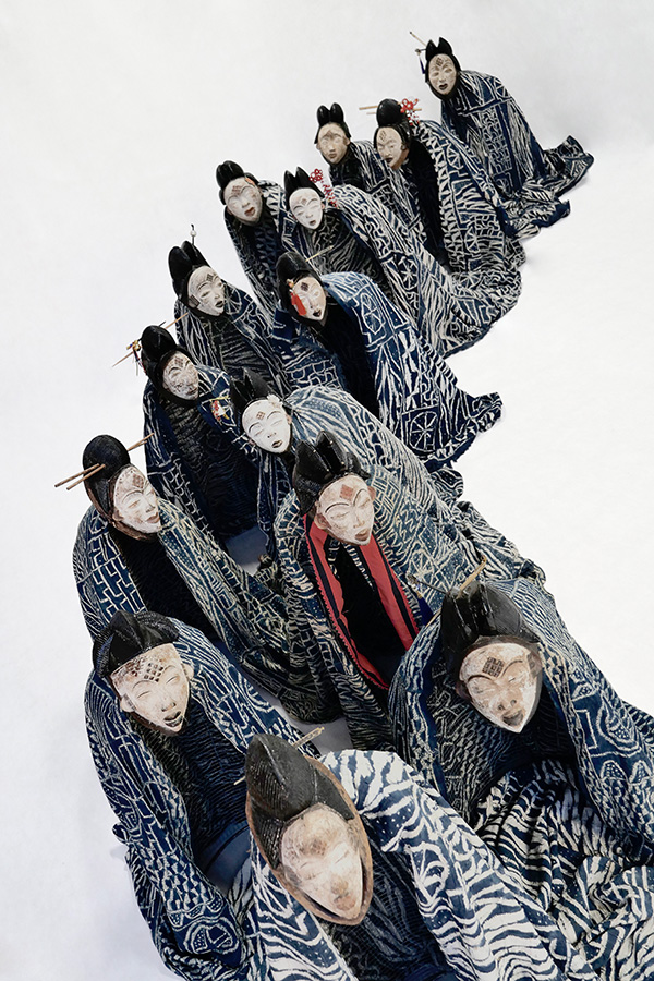 本展では、日本とアフリカの文化的親和性について、心を弾ませるような新たなビジョンを示す彫刻や着物などの芸術表現作品、具体的には、日本の漆によってリ・イマジンされた伝統的アフリカのマスク、アフリカの布でつくられた着物、表象的なインスタレーションの代表作、本展のために特別に制作された作品、などを展示致します。ムアングの芸術は日本とアフリカの伝統を超えた「第三の美意識」へ私たちを誘います。