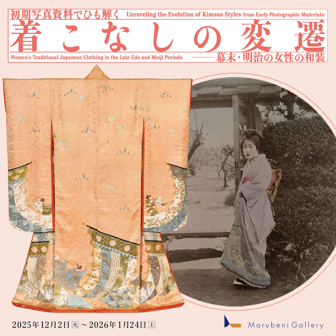 本展は、江戸時代後期から明治時代に至る和装の着こなしを、女性の服飾を例に、幕末に流入した写真や文献を参照しながら、当時の着物や帯・小物を用いて再現します。丸紅コレクションが有する豊富な着物と、丸紅が取り組む染織研究が可能にした「100年前の着こなし」を、ぜひご覧ください。