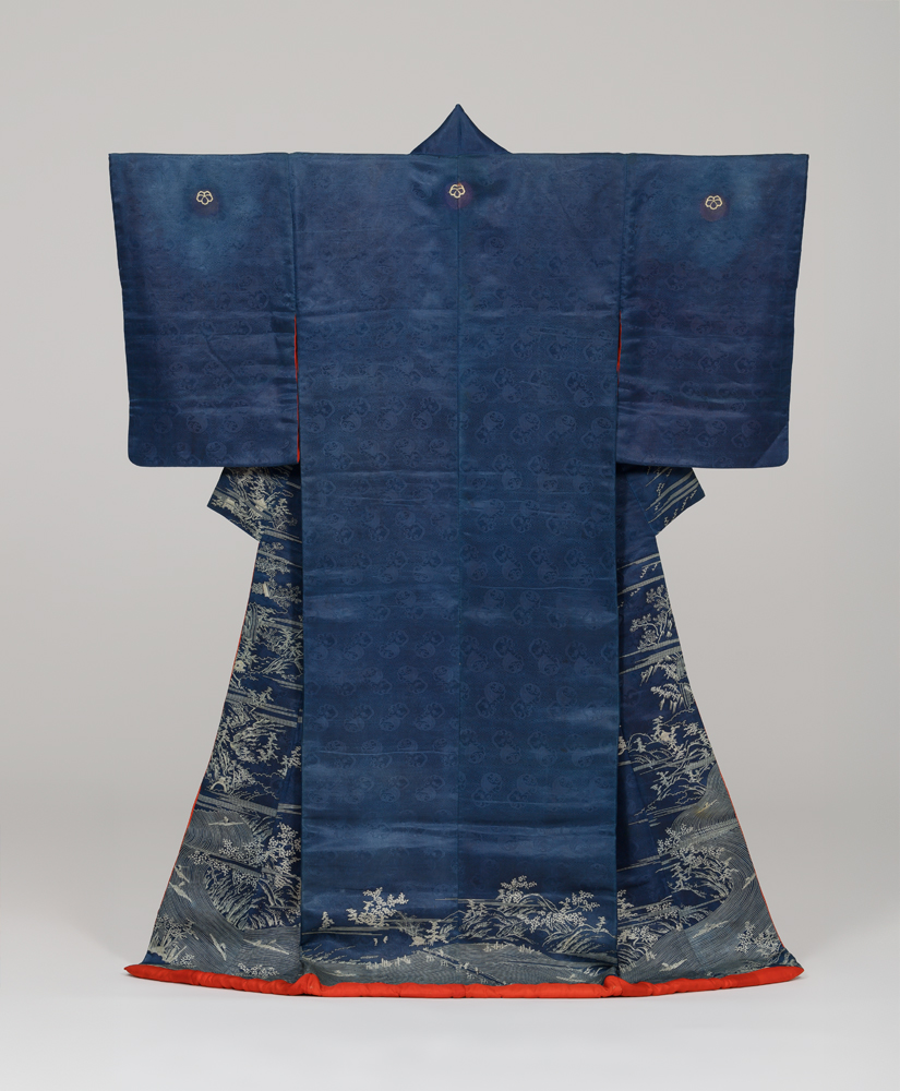 藍鼠綸子地筏流風景模様小袖
