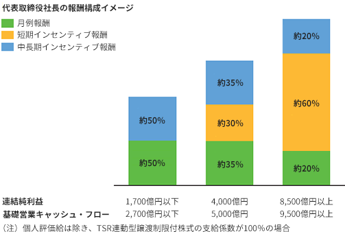 報酬等の構成比率については、中長期的な企業価値向上を重視した報酬構成とし、代表取締役社長については連結純利益4,000億円かつ基礎営業キャッシュ・フロー5,000億円の時に月例報酬/短期インセンティブ報酬/中長期インセンティブ報酬の構成比率が概ね1:1:1となるように設定します。なお、他の社内取締役については、代表取締役社長の報酬構成比率に準じて役位ごとの役割・責任を勘案し報酬構成比率を設定します。