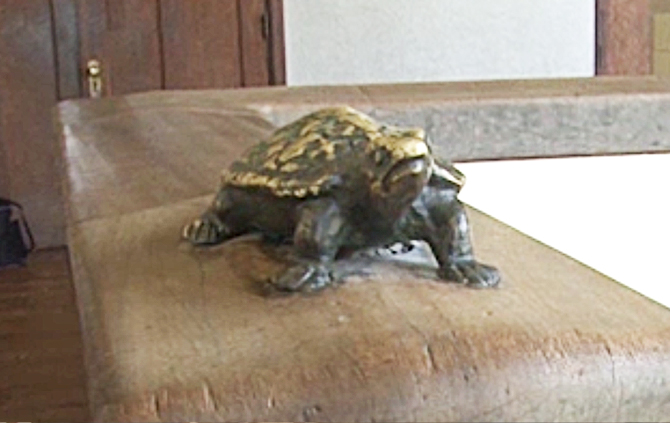 昼寝をしているうさぎを仰ぎ見るようにして、階段の手すりを一歩ずつ進んで行くカメは、これまで多くの子どもたちに触られて変色し、黄色と緑のまだらになっている。うさぎを追い抜いたカメは階段のてっぺんから、大きな窓越しに雄大な景色を眺めている。