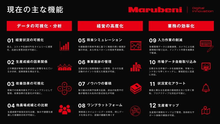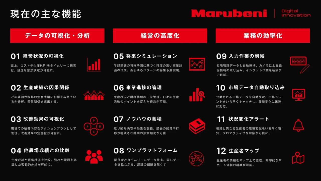 BeecoProgramは丸紅グループが日本中・世界中にネットワークをもち、長い歴史のなかで培ってきた信頼があったからこそ実現したものだ。さらにはBeecoProgramを通じて得られたデータを通じて丸紅グループが扱う飼料の価値を定量的に評価することで、飼料の売上向上に貢献するなど、既存事業とのシナジーを生み出しうることも、これまで酪農・畜産業界でビジネスを展開してきた丸紅グループだからこそ起こせる変革だと言えるだろう。もちろん、単にネットワークや信頼があれば有用なデータプラットフォームをつくれるわけでもない。総合商社のもつ基盤とスタートアップレベルのスピードを融合させることで初めて、酪農・畜産業界全体をデジタル化しうる革新的なプラットフォームが生まれたと言える。BeecoProgramはデータという資源を活用することで生産者だけでなく無数のステークホルダーを巻き込んでいきながら、酪農・畜産業界のあり方そのものを大きく変えようとしているのだろう。