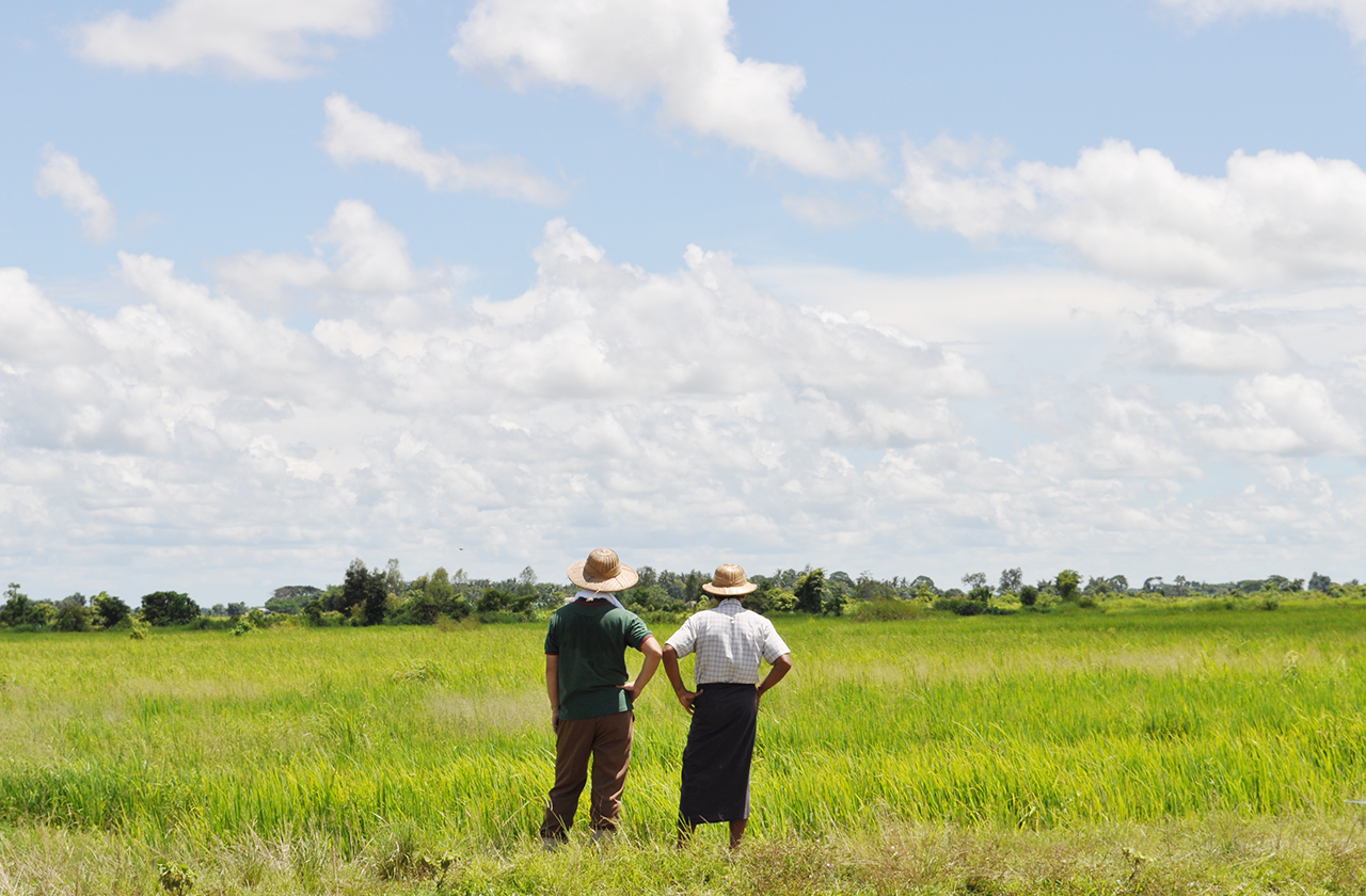 見渡す限り緑一色の水田地帯を、稲をかき分けるように風が吹き抜けていく。ミャンマーの最大都市ヤンゴンに隣接するバゴー県は国内有数のコメ生産地。点在する各農家の水田を巡り歩いてみると、遠くからは同じように見えた稲の生育に大きな差があることがわかる。しっかりと根を張り、空に向かって大きな穂を伸ばす稲、どこか頼りなげで穂も小さく、色も黄色がかった稲。