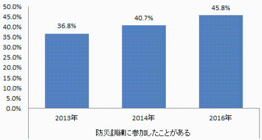 | 自宅に救急グッズを備蓄している | : | 2013年 31.6% → 2014年 34.4% → 2016年 30.6% |