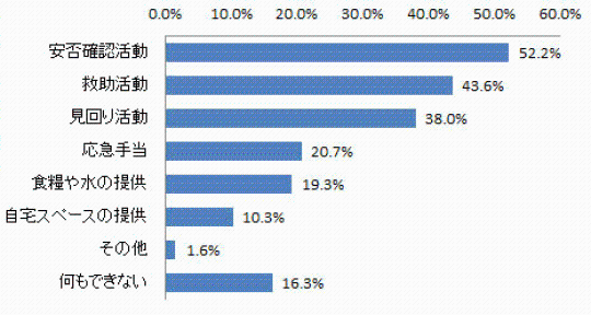 今回新たに「共助への協力」について質問したところ、52.2%が「安否確認活動」、43.6%が「救助活動」に協力すると回答し、マンション内での助け合いへの協力意向が高いことが分かった。
