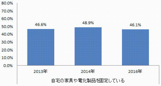 | 自宅の家具や電化製品を固定している | : | 2013年 46.6% → 2014年 48.9% → 2016年 46.1% |