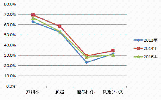 | 自宅に飲料水を備蓄している | : | 2013年 62.8% → 2014年 69.4% → 2016年 66.7% |