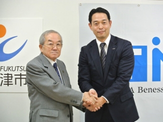 左:小山達生 福津市長 右:丸山英毅 TMJ代表取締役社長