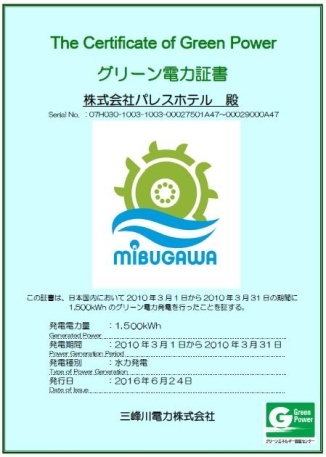 丸紅とパレスホテルは、グリーン電力の環境付加価値を取り引きするグリーン電力証書システムを利用し、パレスホテルがグリーン電力証書発行事業者である丸紅100%子会社の三峰川電力株式会社が発行するグリーン電力証書(1,500kWh)を購入することで、株主総会会場での使用電力をグリーン電力でまかないました。