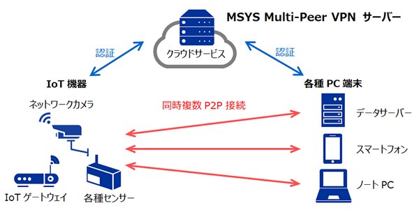 通信の開始時にサーバーに接続して端末認証を行った後、端末やIoT機器間で複数同時に、P2P(Peer to Peer)の接続が可能です。様々な利用シーンにおいて、端末やIoT機器同士がVPN接続で安全に通信することができます。