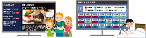 ・ 客室テレビのリモコン1つで簡単に清掃開始・終了、点検完了の作業報告。