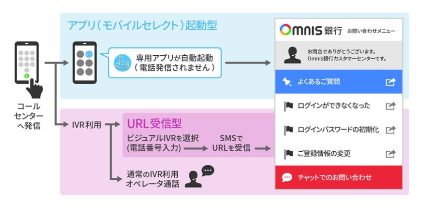 Omnis ビジュアルIVRはアプリによるメニュー起動方式にモバイルセレクト株式会社が提供するアプリを採用し、SMSによるメニュー表示方式と組み合わせることにより、スマートフォンでビジュアルIVRを実現するソリューションです。