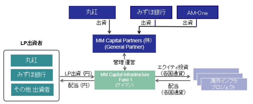 丸紅、みずほ銀行、AM-Oneの3社の出資により、ファンド運営会社としてMM Capital Partners株式会社(社長 後藤朝英、以下「MMCP」)を設立し、海外における民間主導型インフラ資産へのエクイティ投資、及びポートフォリオ構築を目的としたファンド『MMキャピタル・インフラストラクチャー・ファンド1号』(以下「本ファンド」)を運営・管理します。
