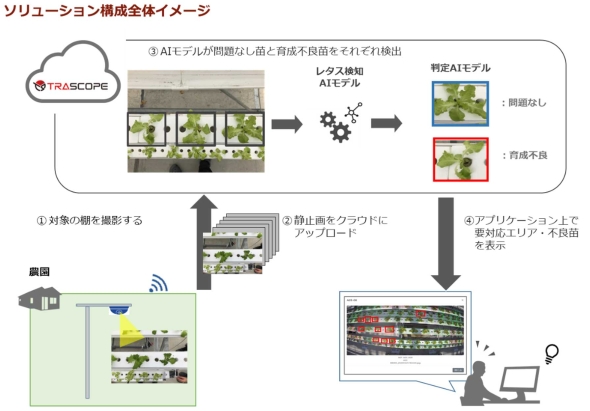 本システムでは、丸紅ネットワークが提供するAI分析映像監視サービス「TRASCOPE-AI」を用いており、レタス棚の静止画をクラウドにアップロードし、クラウド上でAI解析することにより、育成不良苗を検出します。検出結果は作業者へ通知します。