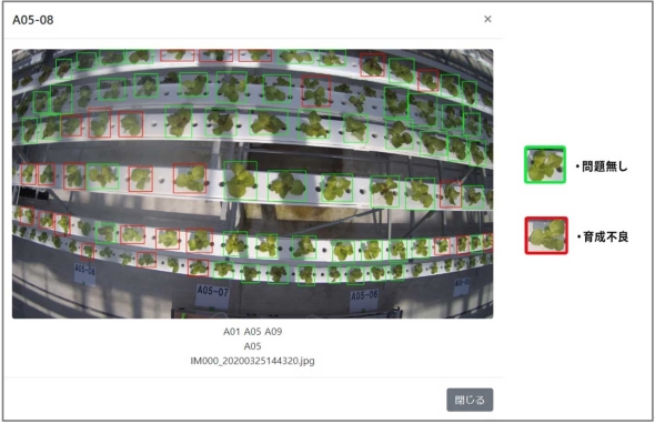 良苗・不良苗を学習したAIモデルにより、不良苗を漏れなく検知し、作業者へ通知が可能となりました。不良苗の発見後、早期に対応することで、生産効率を改善できます。本システムは第一弾として、羽生市レタス水耕栽培農園の運用モデルを基に開発されました。