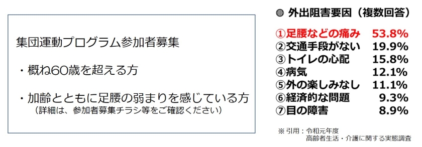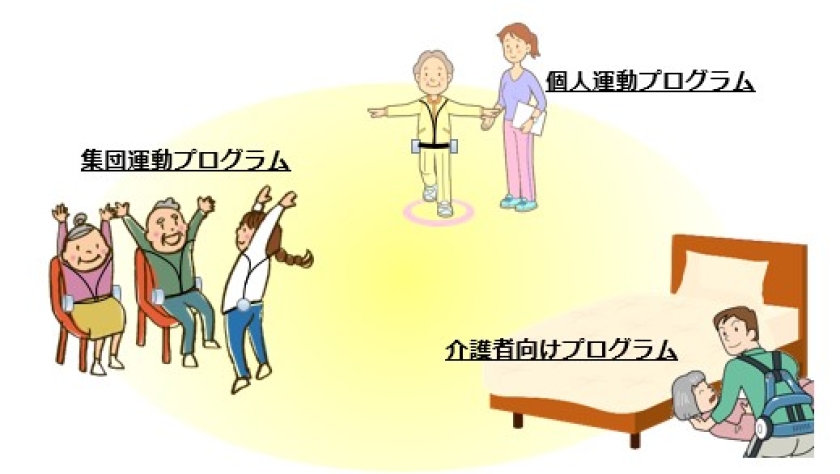 随意運動プログラムは、HAL🄬を装着した状態で、装着者の意思に従った立ち座り運動やスクワットなどの簡単な体幹運動を実施いただく予定で、教室等における複数人を対象とした集団運動プログラムと、希望者に機器を貸出して個人宅で行う個人運動プログラムを実施します。その他、介護する家族などの労力を軽減する介護者向けプログラムを含めての3種類を準備しています。