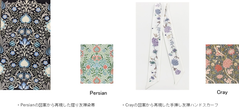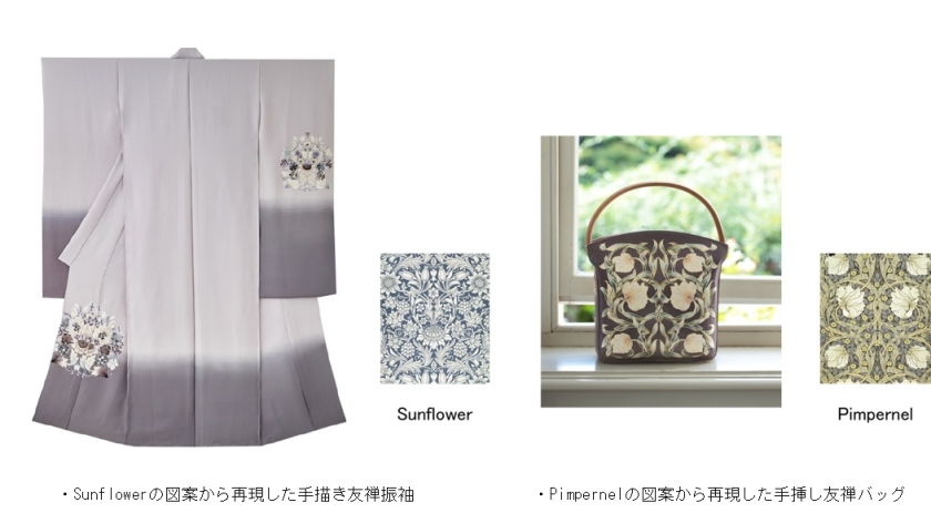 京都丸紅は、V&Aのリサーチ・商品開発チームと共に、V&Aが所蔵するウィリアム・モリスの数々の内装用生地の中から、ピンパーネルやクレイ(※2)などの華麗な図案や同時期に活躍したアーサー・ヘイゲイト・マックムルドやルイス・フォーマン・デイなどの秘蔵の美しい作品をセレクトしました。そして、それら19世紀のデザインが着物、帯、ショール、バッグなどに生まれ変わりました。