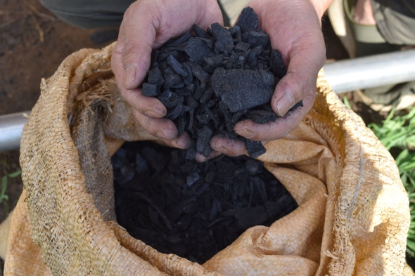 バイオ炭は、バイオマスを加熱(炭化)して作られる固形物です。植物が吸収したCO2は、廃棄・分解時に排出されてしまいますが、炭化により固定すれば大気中への排出を抑えることができます。