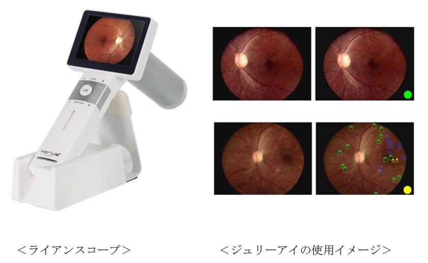 ジュリーアイは、AI関連技術であるディープラーニング(深層学習)を応用して、ライアンスコープ等で撮影した眼底写真から 白斑や出血等の症状※3を検出し、その結果により経過観察を目的とする検査や専門医による精密検査等の受診を推奨する機能があります。