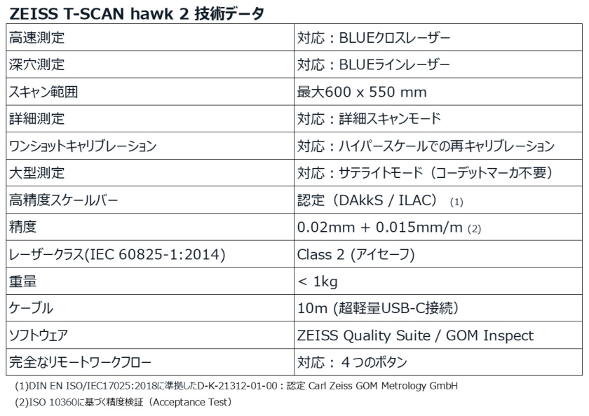 ZEISS T-SCAN hawk 2 は、Carl Zeiss GOM Metrologyの3Dスキャンプラットフォーム「#HandsOnMetrology」の新たな製品としてラインナップに追加された、直感的な操作性を備えた次世代の軽量3Dレーザースキャナです。シンプルで使い易いユーザーガイダンス、測定作業を手元のボタンで操作できるリモートワークフロー機能により、パソコンの前でソフトウェアを操作する必要はありません。波長の短いBLUEレーザーを採用することで、光沢面や黒物、微小な形状のスキャンに対応し、高解像度のスキャンデータを提供します。解像度と測定視野のシームレスな調整により、深いポケット・狭いエリア・手の届きにくい箇所の測定を実現する多彩なスキャンモードを備えています。測定物に投影されるREDレーザーマーカーで最適な測定距離をコントロールし、ハイクオリティなスキャンデータを取得できます。また、最大4メートルまでの大型対象物を手軽にスキャンできる新しいサテライトモード機能を搭載した初めての3Dスキャナで、従来のコーデットマーカーを使用した内蔵フォトグラメトリ機能は必要ありません。計測技術で信頼のあるドイツCarl Zeiss GOM Metrologyが開発・製造する高精度ハンドヘルドスキャナで、精度検証は業界最高基準であるISO 10360に基づいています。HyperScaleでのワンショットキャリブレーション機能を使用して、1つの測定位置のみでセンサーの再キャリブレーションを素早く実行でき、温度変化による精度の影響を受けません。