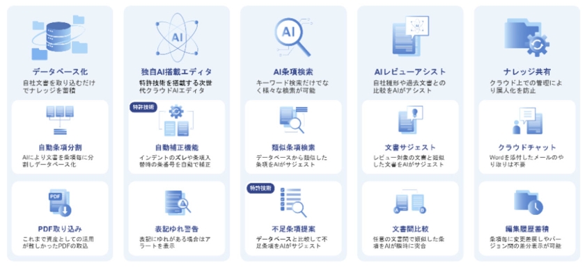 LAWGUEは、契約文書の作成・共有・管理を関係者が共通環境で完結することができるクラウド型サービスです。過去文書をアップロードするだけでデータベース化され、AIのサポートによる様々な検索機能、体裁の自動補正などの編集アシスト、クラウド上でのコミュニケーション等により、ワンストップで従来の文書業務における非効率な作業をなくします。また、英文翻訳や、外部ナレッジとの連携機能を利用することもでき、文書のさらなる品質向上を実現します。