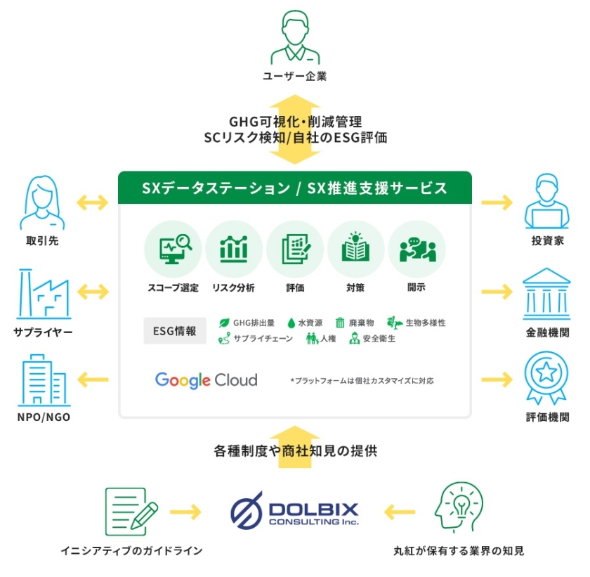 丸紅株式会社(以下、「丸紅」)と、丸紅の完全子会社であるドルビックスコンサルティング株式会社(以下、「ドルビックス」)は、企業のサステナビリティ・トランスフォーメーション(以下、「SX」)への取り組みを支援するため、Google Cloud を活用した情報の一元管理や可視化・分析を行うプラットフォーム(以下、「SXデータステーション」)および関連するコンサルティングをパッケージ化したサービス(以下、「SX推進支援サービス」)の提供を開始しました。