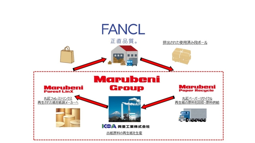 丸紅株式会社(以下、「丸紅」)、丸紅フォレストリンクス株式会社(以下、「丸紅フォレストリンクス」)、丸紅ペーパーリサイクル株式会社(以下、「丸紅ペーパーリサイクル」)、および興亜工業株式会社(以下、「興亜工業」)は、株式会社ファンケル(以下、「ファンケル」)向けに、ファンケルの物流センターで発生した使用済み段ボールを回収し再資源化を行うサーキュラーエコノミー(循環型経済)(*1)モデルを提供します。