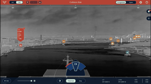 Orca AI社は、昼夜を問わず撮影可能なカメラ「SeaPod」を船上に搭載し、船舶や物標の認識、距離の測定を行いながら、これまでに約20 百万海里分の航海映像を蓄積してきました。また、蓄積したビックデータにAIを用いて画像解析を行うことにより、認識率等の性能を向上させています。解析情報に既存の航海機器から取得した情報を重ねて船上のモニターに表示することにより、特に輻輳海域(※)や夜間における船舶の周辺認知を行う船員に目視情報を補完する機能を提供します。