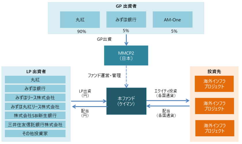 丸紅株式会社(以下、「丸紅」)、株式会社みずほ銀行(以下、「みずほ銀行」)、及びアセットマネジメントOne株式会社(以下、「AM-One」)は、海外インフラ資産へのエクイティ投資を目的としてMM Capital Partners 2号株式会社(以下、「MMCP2」)を設立し、MMCP2が運営・管理する『MMキャピタル・インフラストラクチャー・ファンド2号』(以下、「本ファンド」)を組成、ファーストクローズ(第1次資金募集完了)を実施しました。