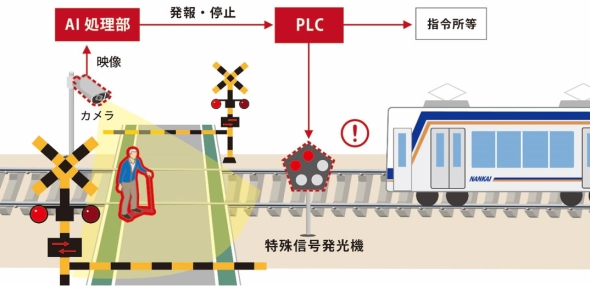 導入試験では、南海電鉄の人道踏切※1に「踏切滞留AI監視システム」を設置し、その検知結果を現場の特殊信号発光機と連動させます。「踏切滞留AI監視システム」は、踏切内に滞留する自動車などの物体を検知するだけでなく、骨格検知により人の滞留も検知することができます。滞留を検知した際には現場の特殊信号発光機と直接連携して、通信網の状況の影響を受けることなく、列車の運転士に迅速に知らせることができます。