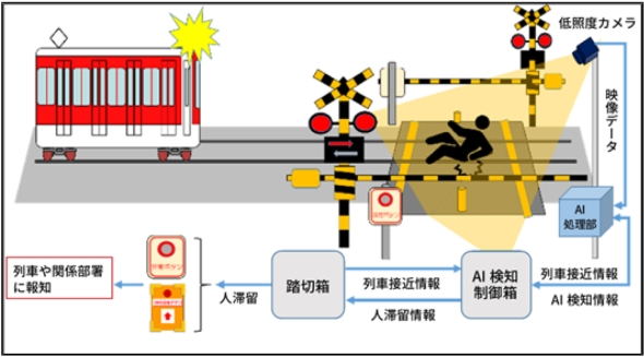 本システムは、踏切道や構内踏切(以下、踏切道等)に設置したカメラの映像をAIが画像解析し、列車接近時、踏切道等に取り残された人を検知した場合、「押ボタン式踏切支障報知装置または非常通報装置を動作」させることで、いち早く列車や関係部署に知らせることが可能となります。